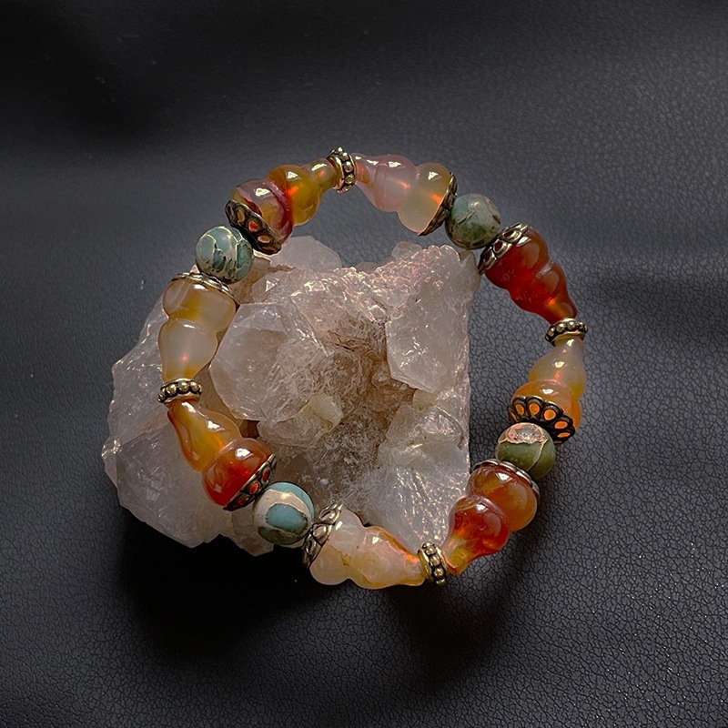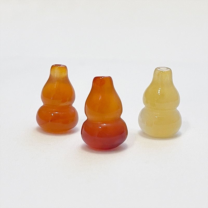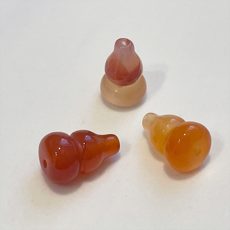 瓢箪(ひょうたん)は「末広がりの形が縁起が良い」「くびれが吸い込んだ邪気を閉じ込め逃がさない」「鈴なりに実のなる様子は子孫繁栄の象徴」などとして、古来より縁起物としても親しまれています。深紅~白まで様々な色の変化が楽しいのもカーネリアンの魅力。瓢箪の形にとらわれず、キャップを組み合わせたり、さかさまに使ってみたりと様々なアイデアで楽しんでみて!